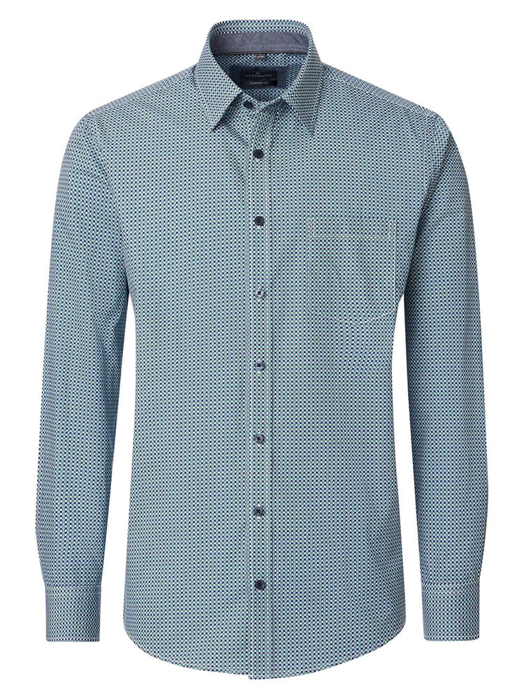 Das Freizeithemd aus der CASAMODA Comfort Fit Kollektion verkörpert die Philosophie des anspruchsvollen Gentleman, der Tradition mit modernem Denken verbindet. Durch die harmonische Verbindung zeitloser Schnittformen mit durchdachten Details entsteht ein Hemd, das sowohl im beruflichen als auch privaten Umfeld besticht. Das gemusterte Modell in elegantem Grün besticht durch seinen klassischen Kent Kragen und avanciert damit zur unverzichtbaren Grundlage jeder gepflegten Herrengarderobe. Ob zu festlichen Gelegenheiten oder im alltäglichen Einsatz – dieses Hemd präsentiert sich mit souveräner Vielseitigkeit. Mit einer passenden Krawatte und einem großzügigen Knoten offenbaren sich seine vollen Möglichkeiten und sein charaktervolles Erscheinungsbild.
