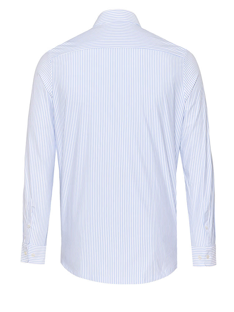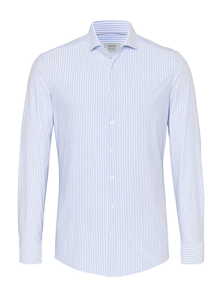 Das PURE Functional Jerseyhemd verkörpert die moderne Eleganz für den anspruchsvollen Herrn. Mit seinem taillierten Schnitt und durchdachten Details bietet es jene harmonische Verbindung aus zeitlosem Design und zeitgenössischem Komfort, die das Fundament einer raffinierten Garderobe bildet. Das hellblaue Streifenmuster dieses Hemdes ist eine klassische Wahl, die sich mit Geschick in vielfältigster Weise kombinieren lässt und in keinem Kleiderschrank fehlen sollte. Der elegante Haifischkragen verleiht diesem Herrenhemd seinen charaktervollen Ausdruck und eignet sich gleichermaßen für besondere Anlässe wie für den alltäglichen Gebrauch. Zur vollendeten Geltung gelangt das PURE Functional Herrenhemd, wenn es mit einer schmalen Krawatte und diskret gebundenem Knoten getragen wird.